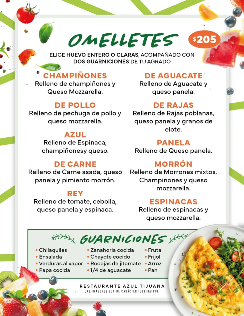 Papa horno, papas a la francesa, elote, guacamole, vegetales rústicos (tomate, camote, zanahoria), pasta fettuccine.
